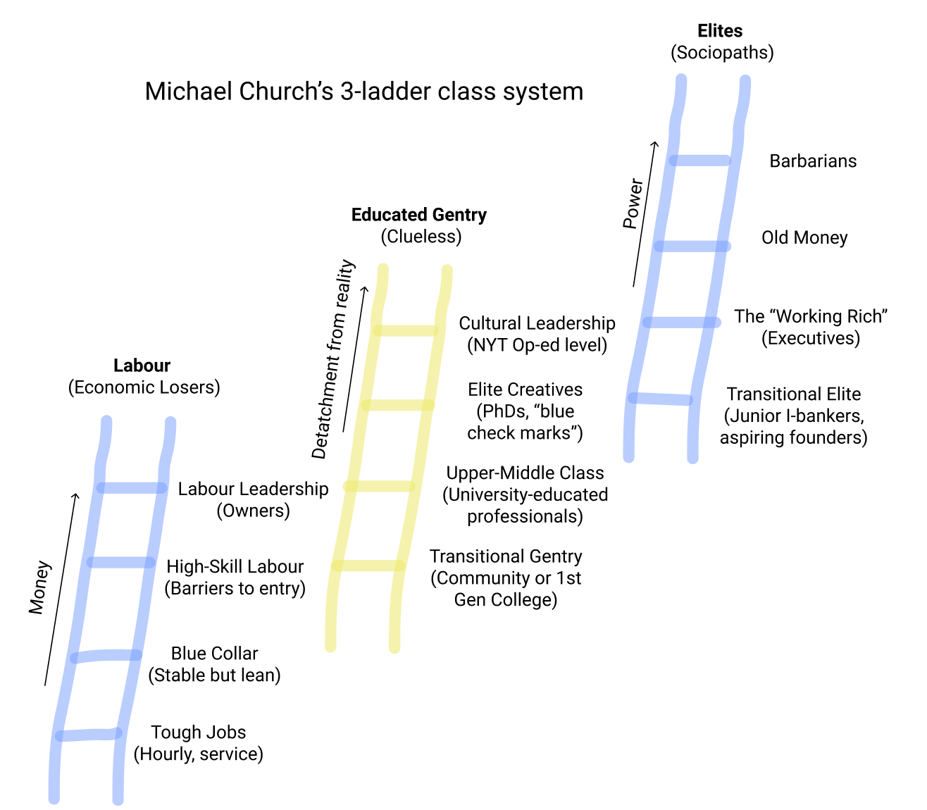 - Michael Church came up with a 3-ladder system of social class) that shows how these groups progress through their lives.