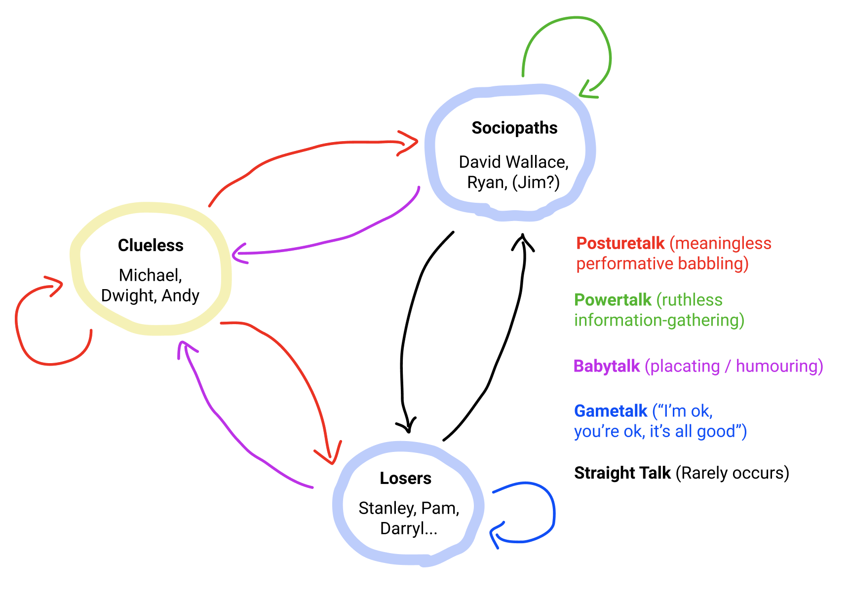 - In the middle are clueless, typical middle managers: e.g., Michale or Dwight or Andy.